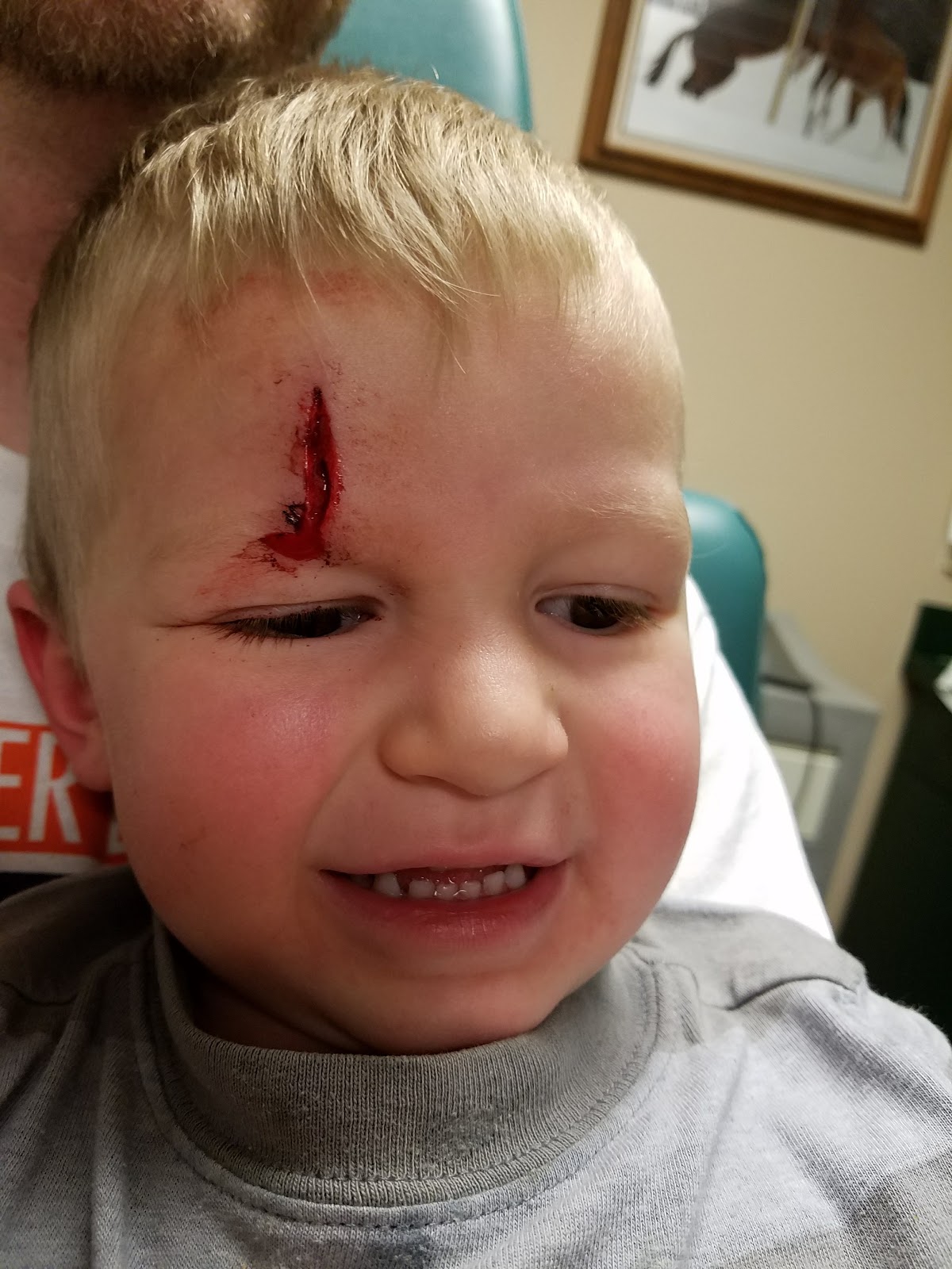 On January 2nd we were hosting the Missionaries for dinner, had just got done eating and were chatting in the kitchen when Linq starts crying and the girls start screaming from the living room. He had been running around, tripped and hit his head just right on the corner of the TV stand and split it right open. The Elders quickly left, Laura came to the rescue and LeGrand and I headed to the hospital with Linq. We had just changed our insurance to a higher deductible and it started on the 1st, ugh. We didn't really want to have to take him to the ER, we knew he just needed stitches. So LeGrand called our awesome PA in town (Brett Smith) just to see if he did stitches, just by chance he and a nurse were still at the office doing paperwork and said to come on by. He was so great and got Linq all stitched up, and saved us a bunch of money :) Through it all Linq was a trooper, even smiling for the nurse!